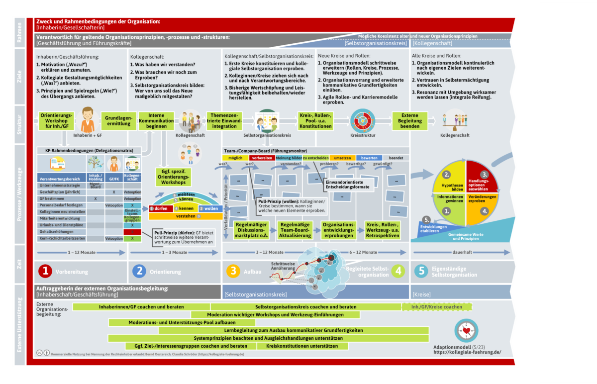 Modell – nicht Anleitung: Wie jedes Modell, so ist auch das hier beschriebene Modell eine Reduktion auf ausgewählte idealtypische Aspekte. Wir verstehen unser Adaptionsmodell als innere Landkarte und grobes Orientierungsmodell. Es ist weniger eine Anleitung, sondern individuell zu reflektieren und zu konkretisieren. Nichtsdestotrotz haben wir tatsächlich Organisationen begleitet, deren Vorgehen dem Modell sehr nahekamen.